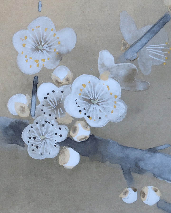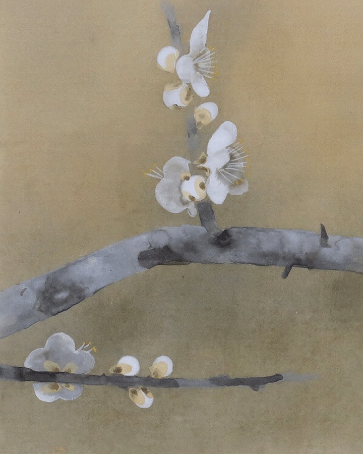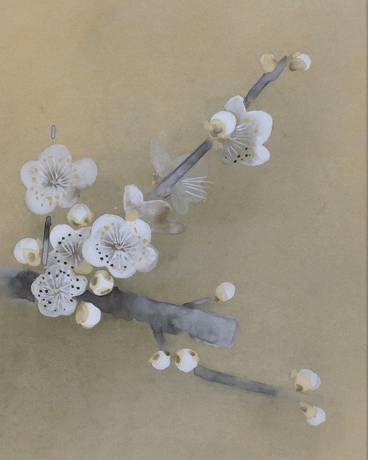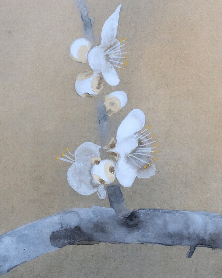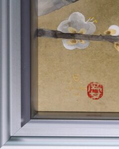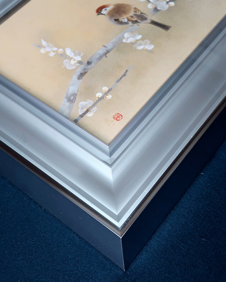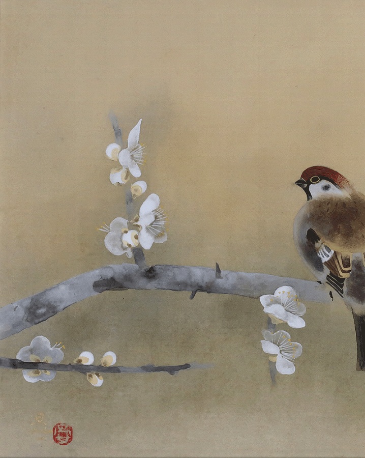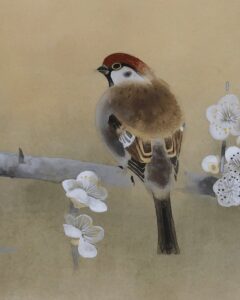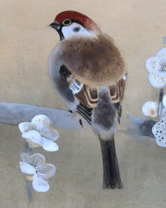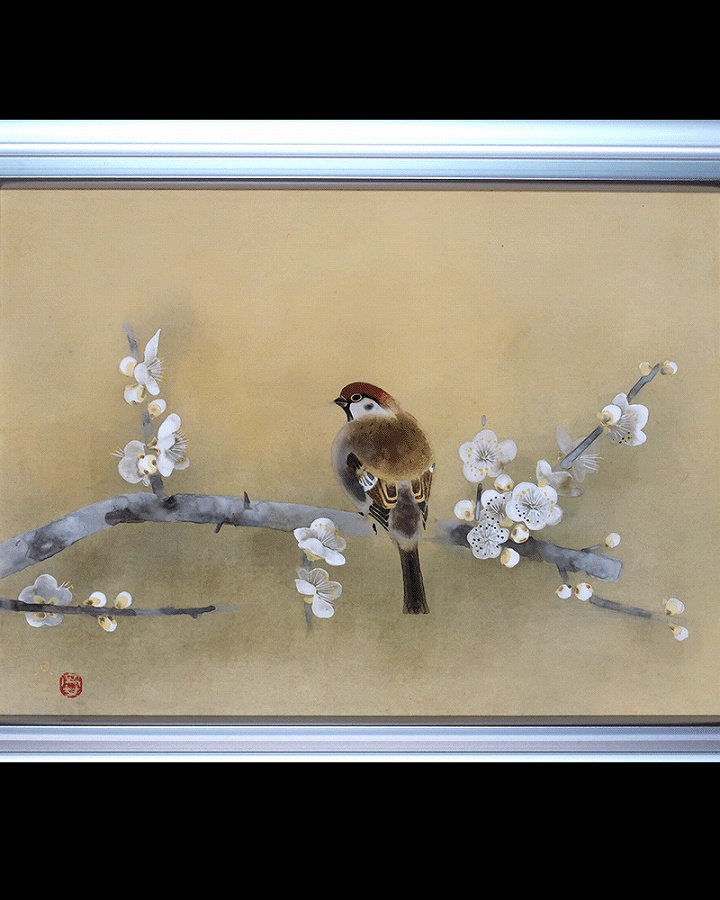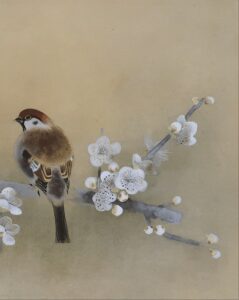 白梅の枝で羽を休めるふくら雀の愛らしい姿が、春の訪れを感じさせる作品です。