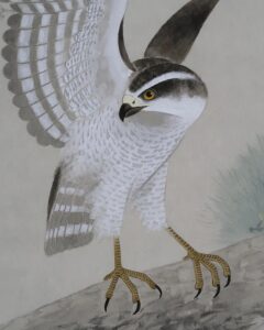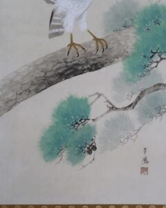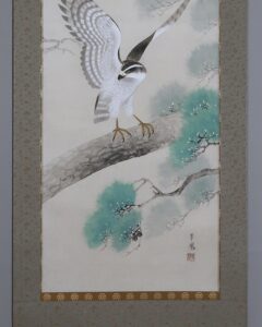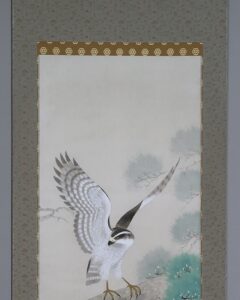 「松」長寿・永遠の命を意味し、「鷹」勇猛さ、志の高さ、立身出世を象徴し、縁起よく年中掛けとしてお掛け頂けます。
