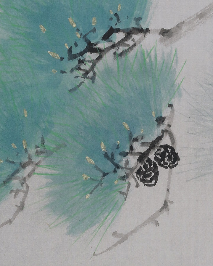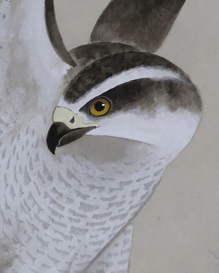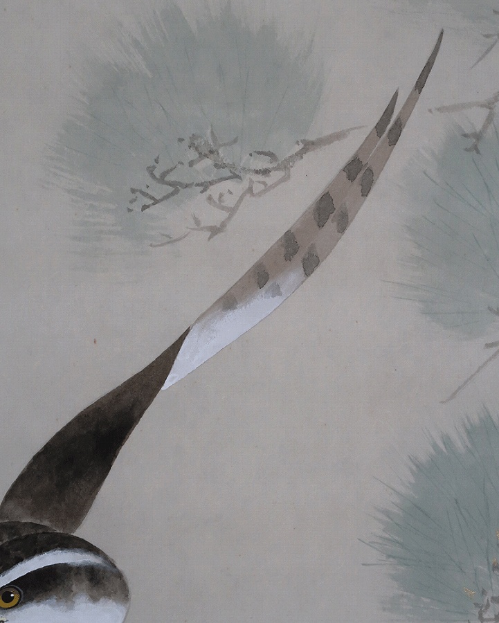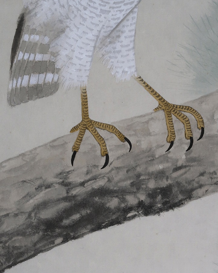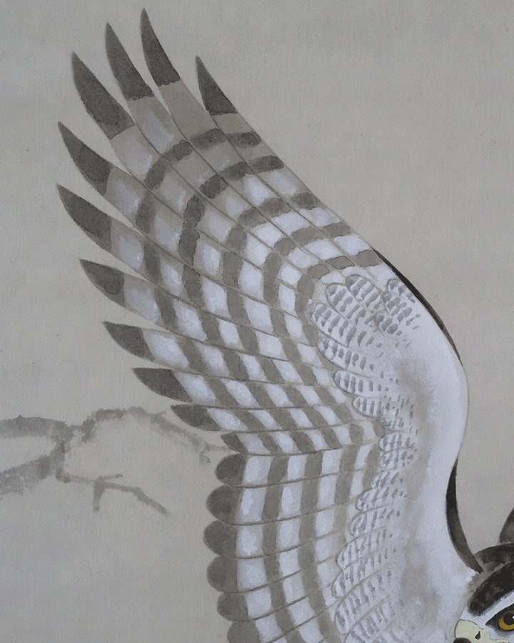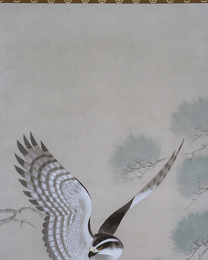 「松」長寿・永遠の命を意味し、「鷹」勇猛さ、志の高さ、立身出世を象徴し、縁起よく年中掛けとしてお掛け頂けます。