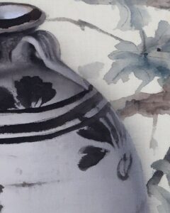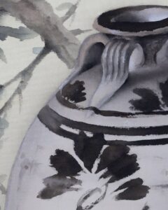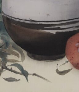 枝は成長・発展、吉祥果は繁栄や幸福の象徴、閑壺は静けさや落ち着きを表現し繁栄と静寂の調和を表します。