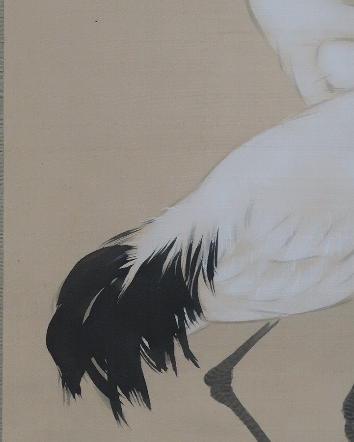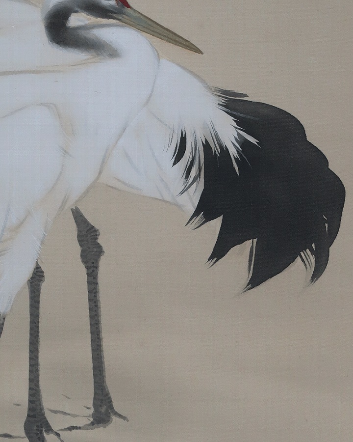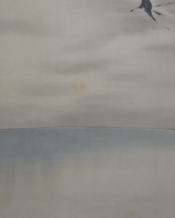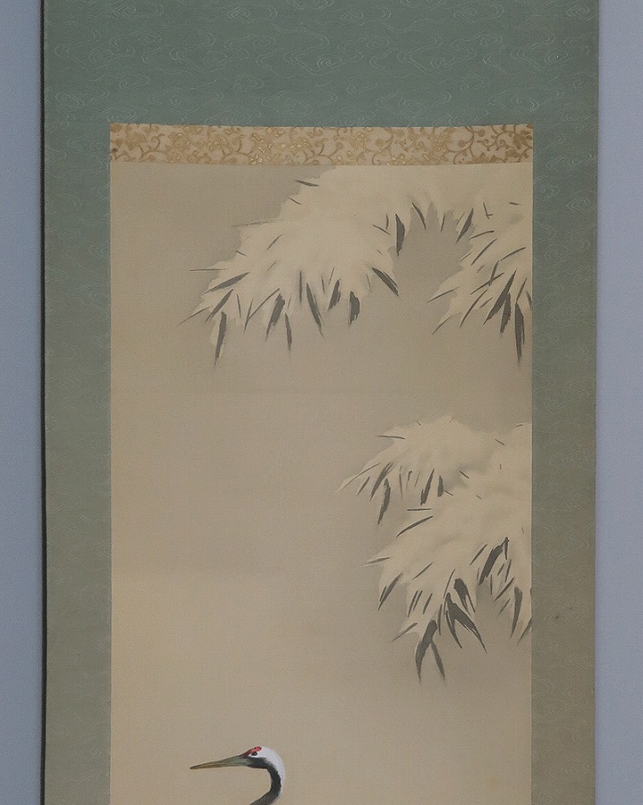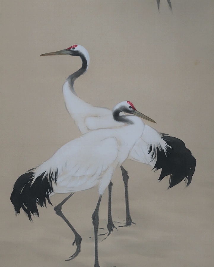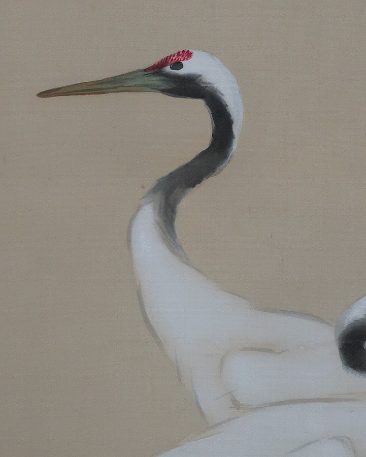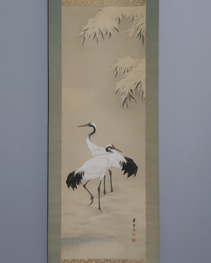 池のほとりに佇む双鶴が風情ある作品です。冬掛けとして上品にお掛け頂けます。