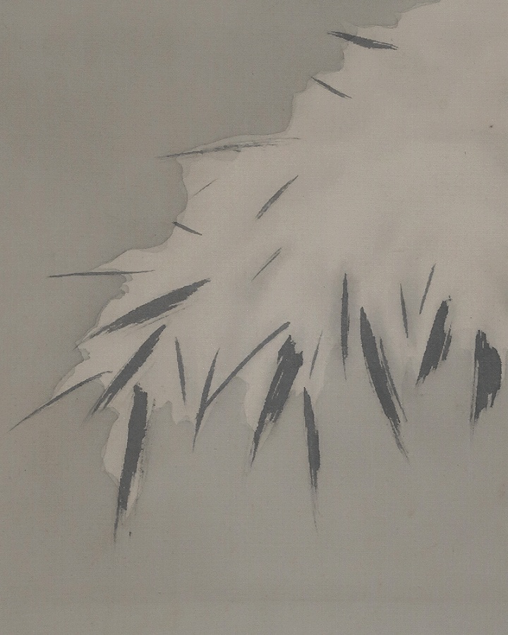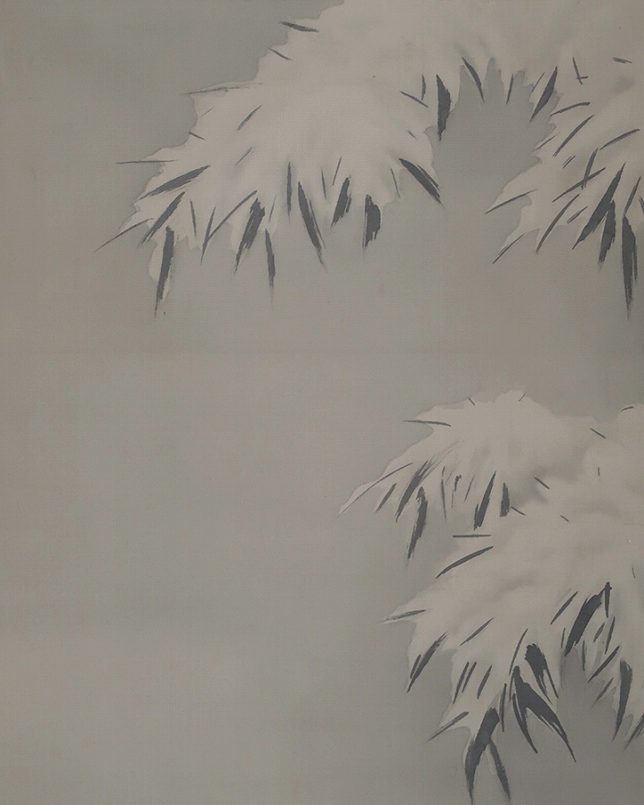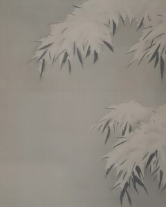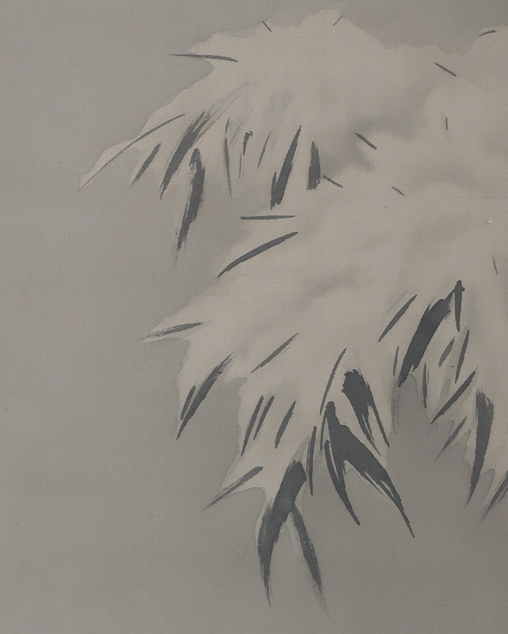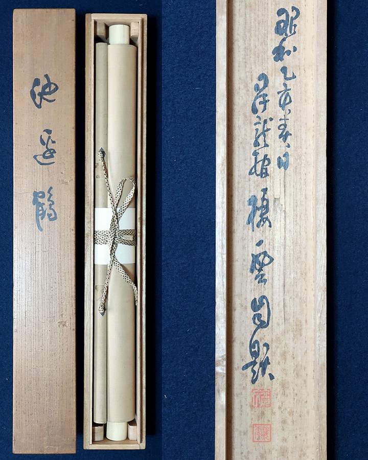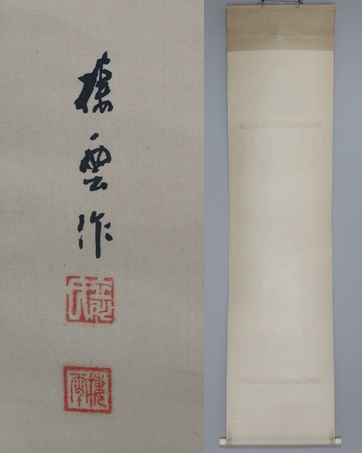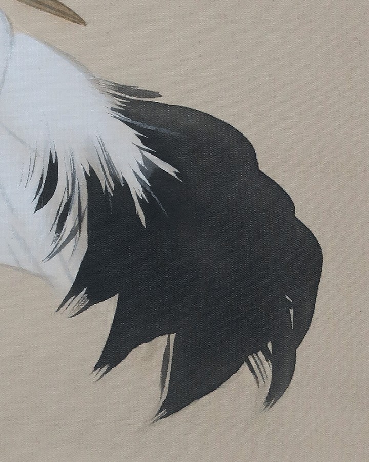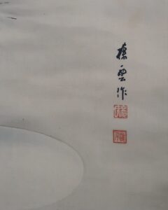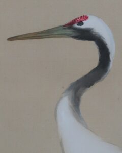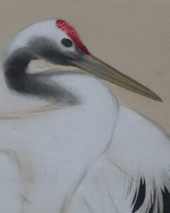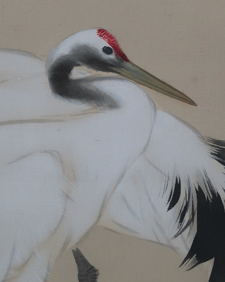 池のほとりに佇む双鶴が風情ある作品です。冬掛けとして上品にお掛け頂けます。