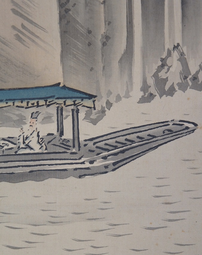 幅が広目の作品になりますので寸法ご確認下さい。顔料良く味わいある作品です。一間床におすすめです。年中掛けとしてお掛けお楽しみ下さい。