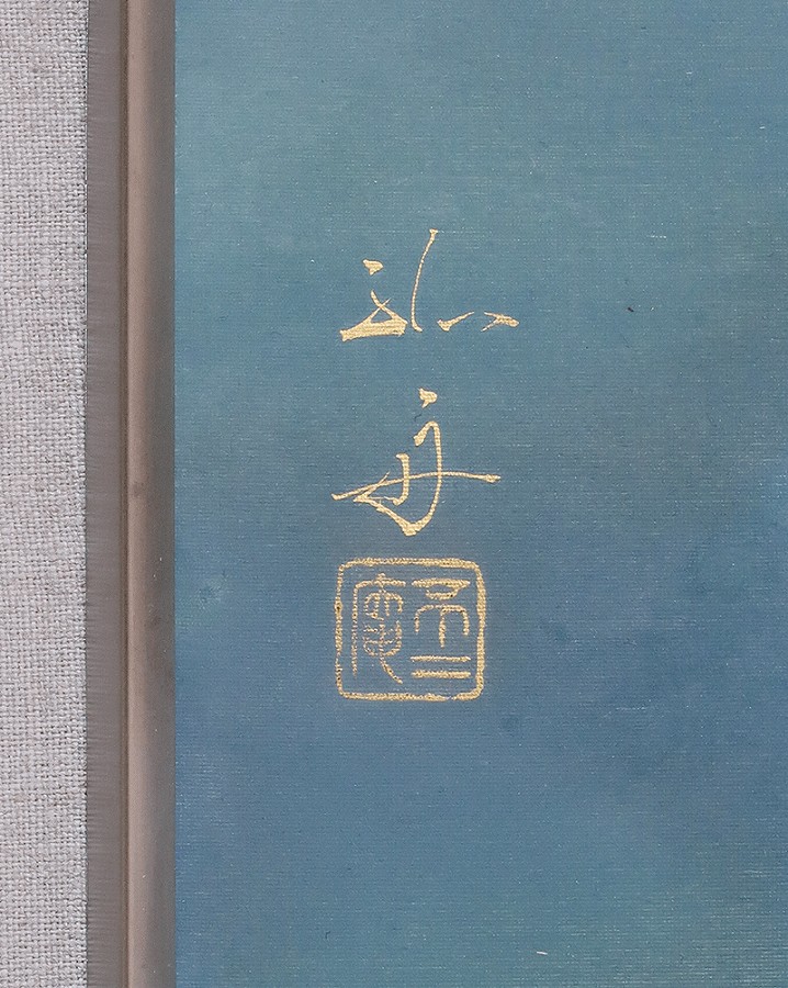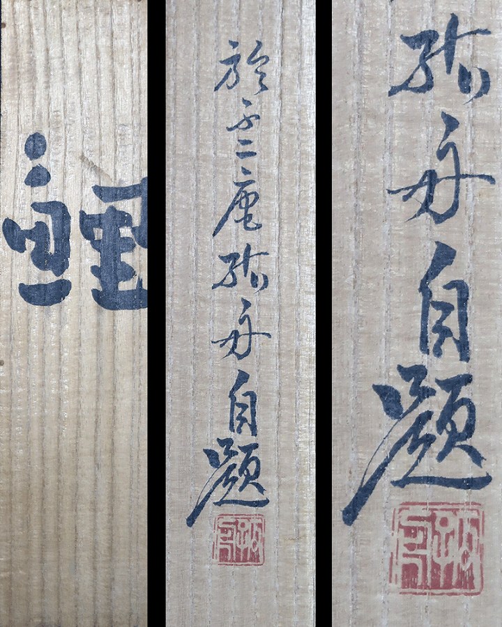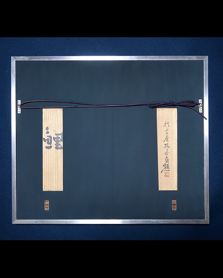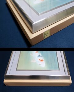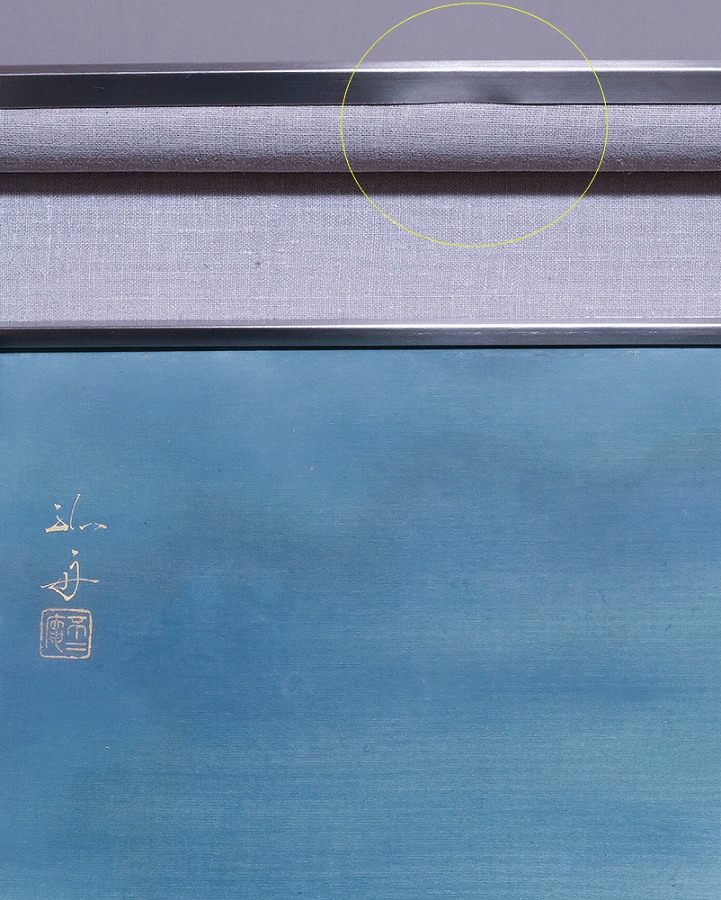 額の落款の右上にごくわずかな凹みがありますので画像ご参照ください。