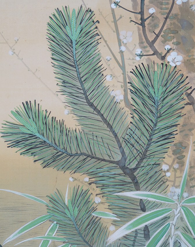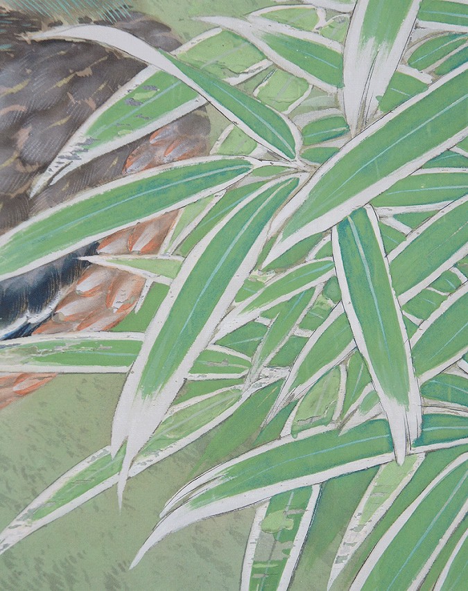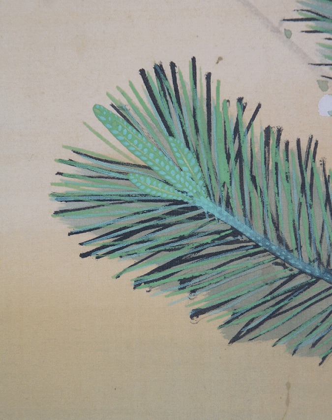 作品全体に経年よごれ、鴛鴦の目に胡粉落ち(白色)と落款上部の笹の葉に顔料落ちがあります。